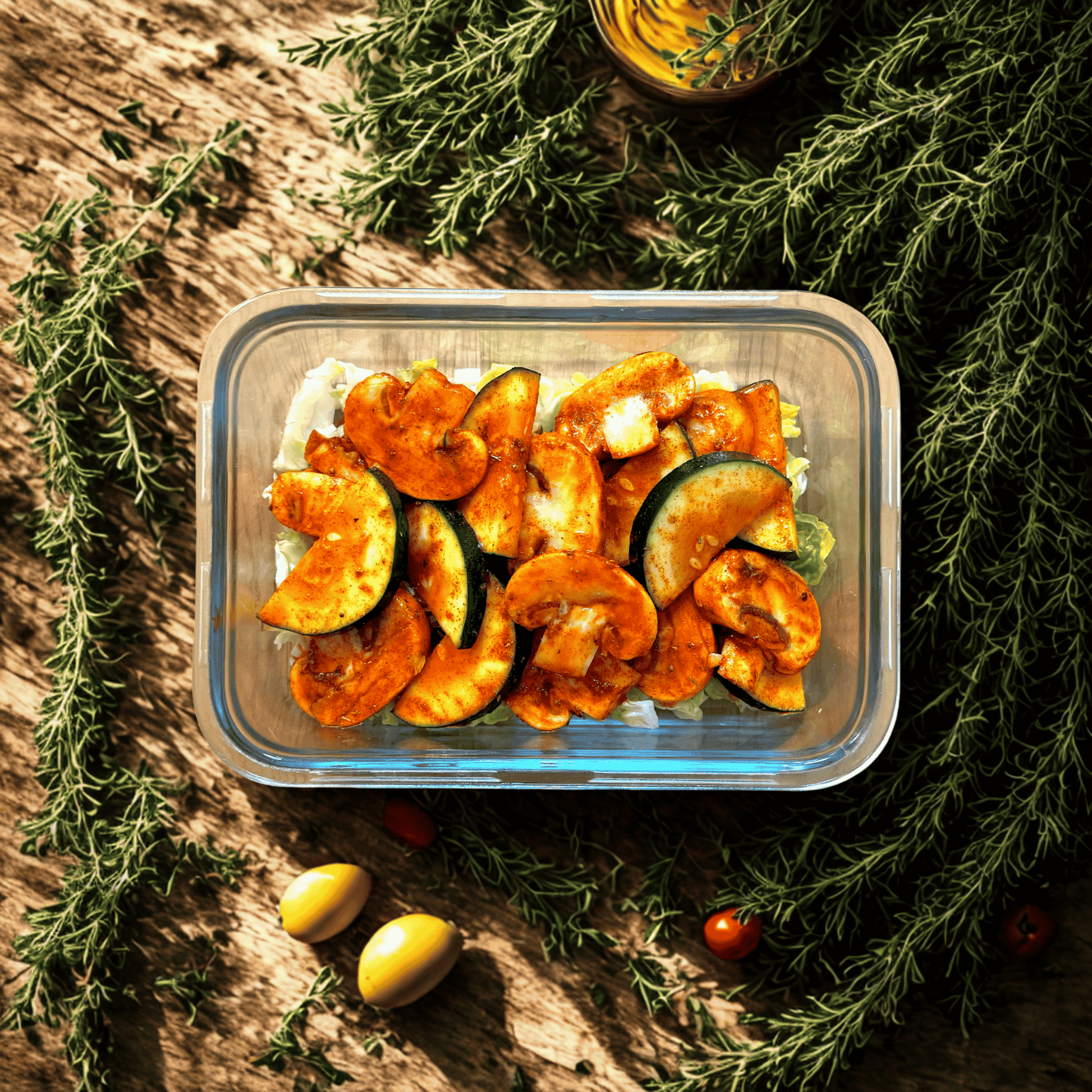 Carpaccio de champiñón, calabacín y aliño de pimentón y AOVE con lechuga