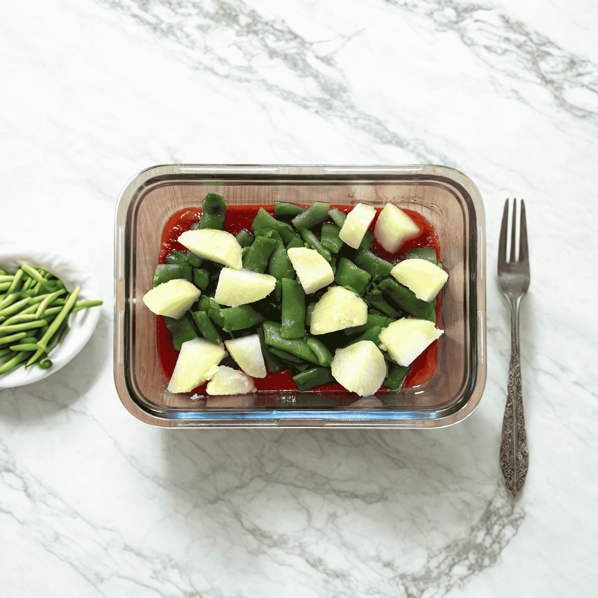 Judía verde con patata sobre base de tomate frito
